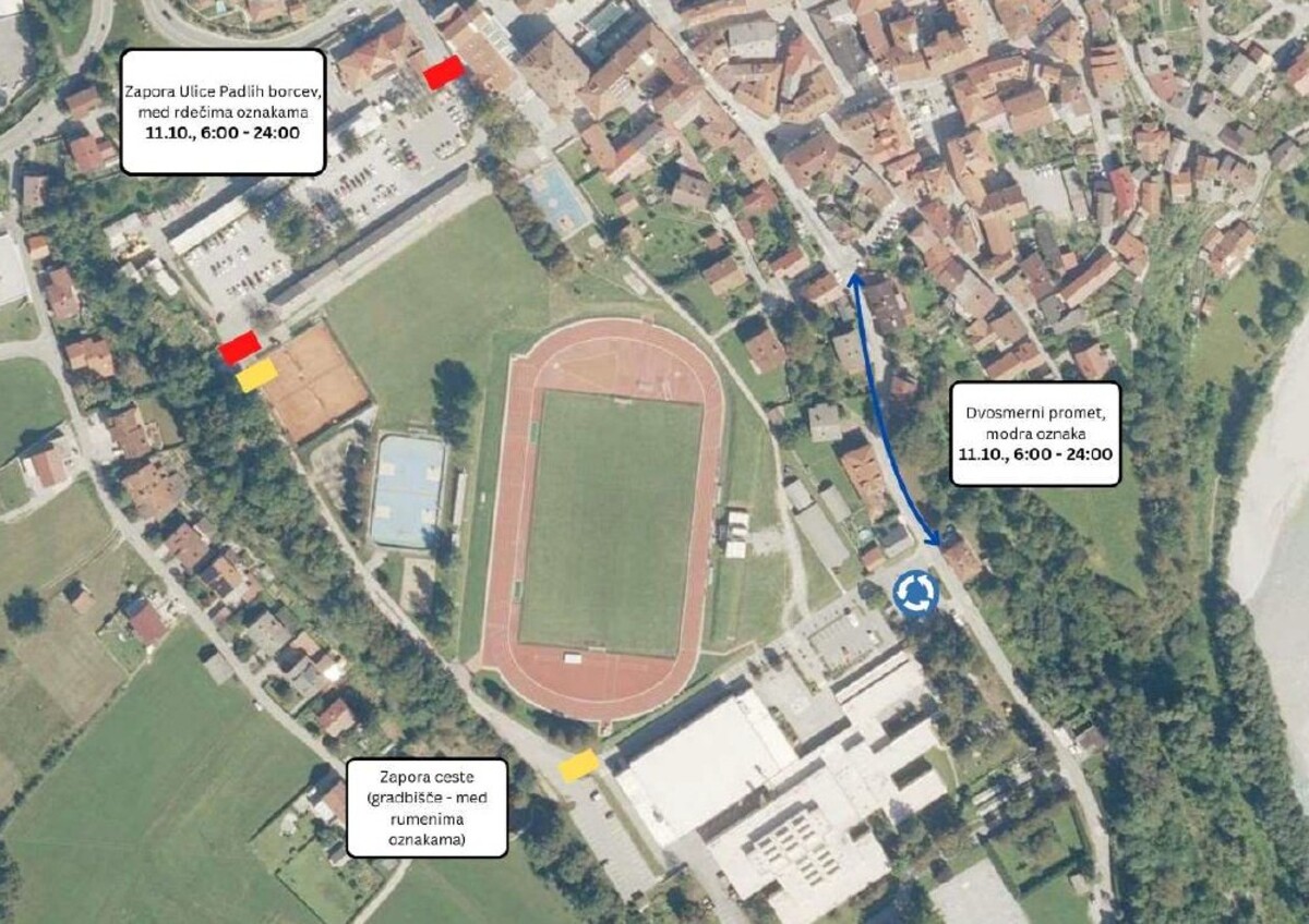 - Asfaltno in makadamsko parkirišče na Ul. padlih borcev se zaradi priprave na prireditev v celoti zapre v petek, 10. oktobra, ob 15.00, zapora pa traja do sobote, 11. oktobra, do 24.00. Krajni del parkirišča (nasproti teniškega igrišča) se zapre že v četrtek, 9. oktobra, ob 18.00, zapora pa traja do nedelje, 12. oktobra, do 20.00.