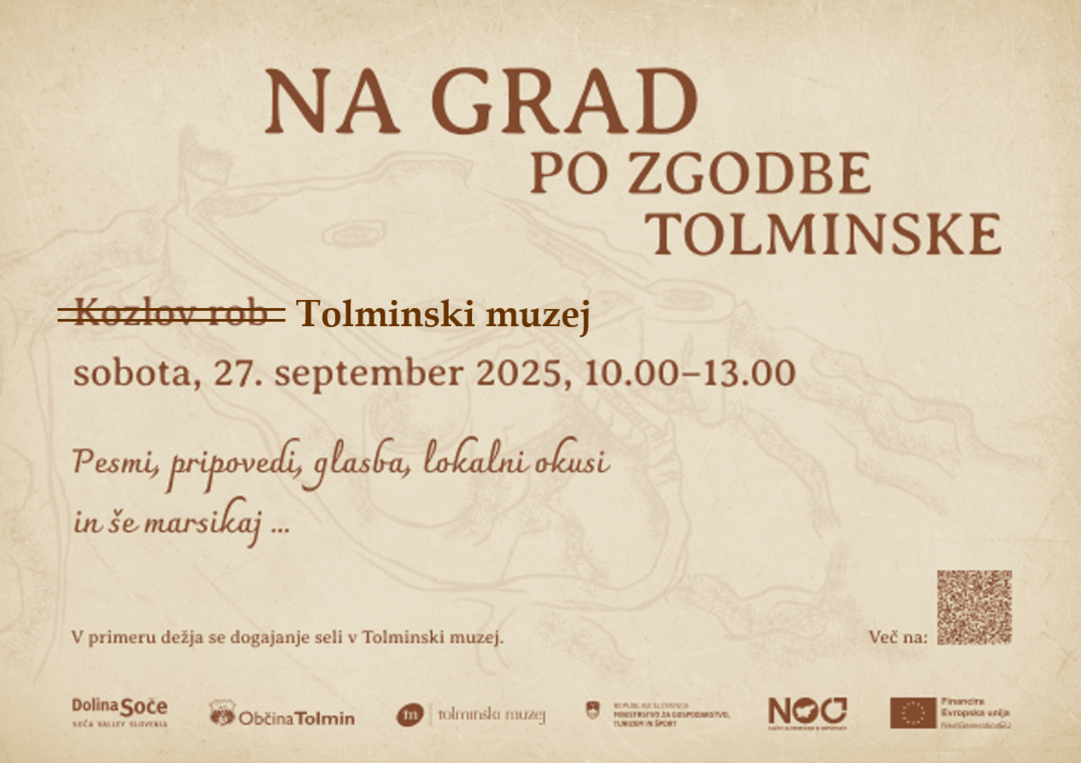 Na Grad po zgodbe Tolminske smo poimenovali dogodek, s katerim smo obiskovalce vseh generacij v soboto, 27. septembra, ob 10.00 dopoldne sprva povabili na Kozlov rob. Ker deževje ne dopušča ustrezne in varne priprave prizorišča, pa tudi vremenska napoved za soboto ni obetavna, smo se prvo izvedbo dogodka odločili prestaviti v Tolminski muzej. Coroninijev dvorec na Mestnem trgu, v katerem ima danes sedež Tolminski muzej, je sicer najmlajši med tolminskimi grajskimi stavbami in je bila zgrajena v drugi polovici 17. stoletja kot nadomestek za propadajočo in težko dostopno grajsko utrdbo na Kozlovem robu.