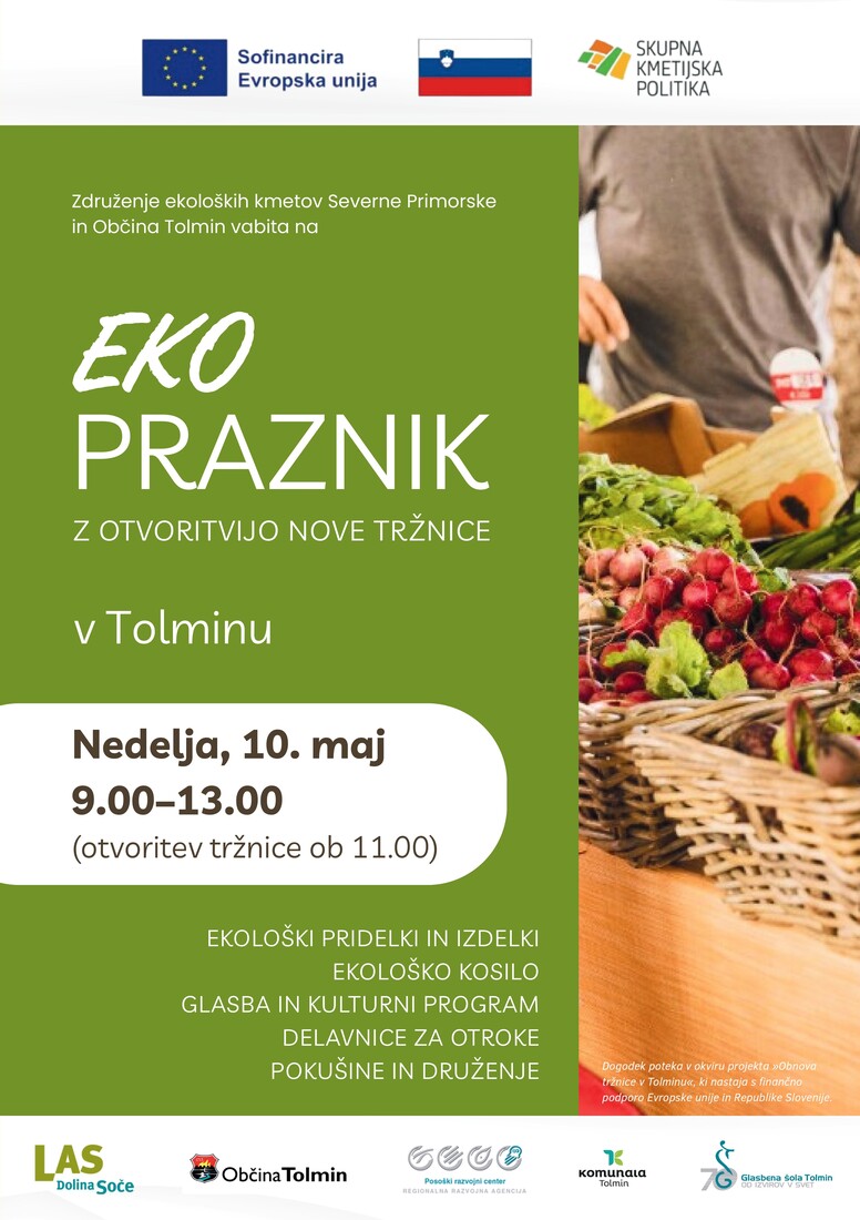 Občina Tolmin in Združenje ekoloških kmetov Severne Primorske vabita na EKOpraznik z otvoritvijo nove tržnice v Tolminu, ki bo v nedeljo, 10. maja, od 9. do 13. ure. Dogodek bo ob vsakem vremenu, saj je nova tržnica pokrita.